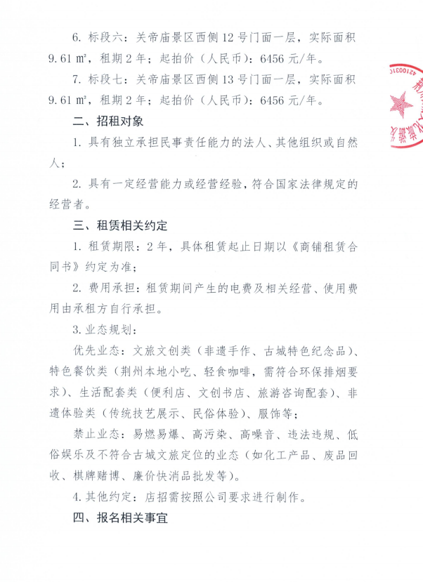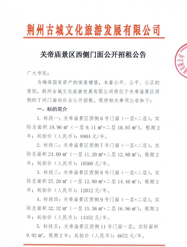 关帝庙景区西侧门面公开招租公告