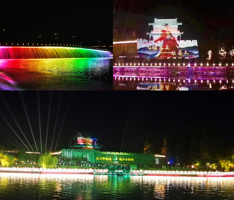 夜晚漫步在荆州古城东门护城河畔,可以欣赏到一场充满现代文化创意、科技气息的以东门宾阳楼为幕布的"光影秀",在灯光的映衬中,古城墙、宾阳楼、关公圣像、金凤腾飞、九龙柱、屈原像等城市标志更加流光溢彩、熠熠生辉,开启了古城夜游新篇章。整个"光影秀"时长8分钟,分为天、地、人、和四个篇章,主要展示荆州人文历史、旅游资源,一幕一个故事,让游客深深沉醉其中。